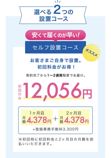 ※また商品のお届け目安は、「業者設置コース」は2~3週間程度、「簡単セルフ設置コース」なら1~2週間程度となっており、「簡単セルフ設置コース」の方が約1週間も早くお届けできます。