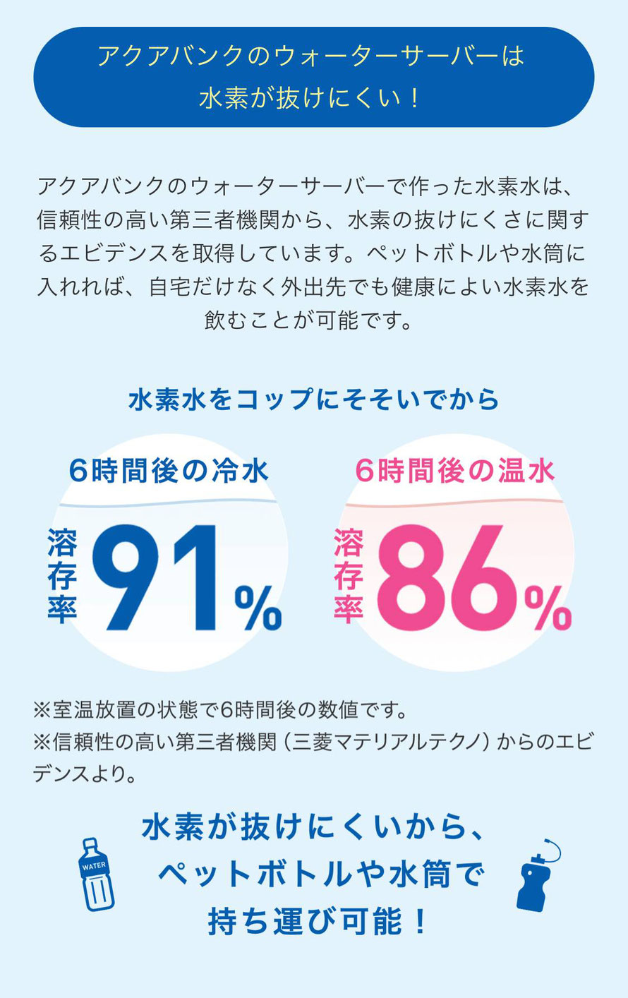 アクアバンクには、他のウォーターサーバーやミネラルウォーターとは違い、多くの水素が含まれています。