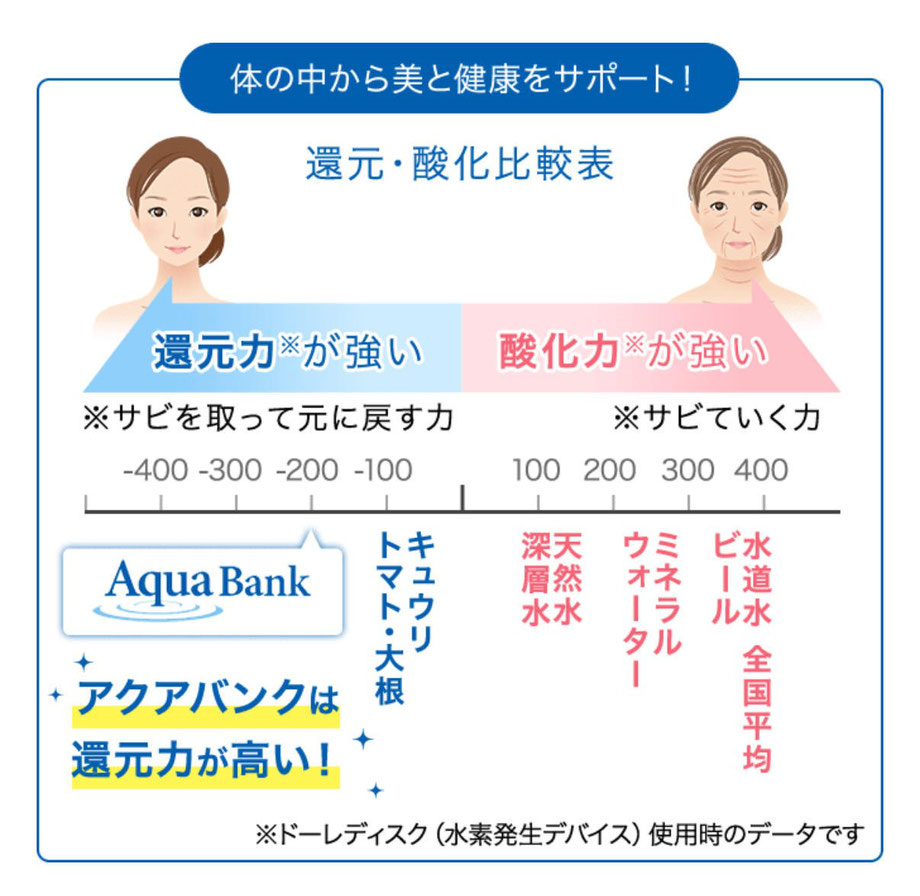 市販されているお水も身体を酸化させてしまいます。アクアバンクの水素水は、高い還元力のお水です。