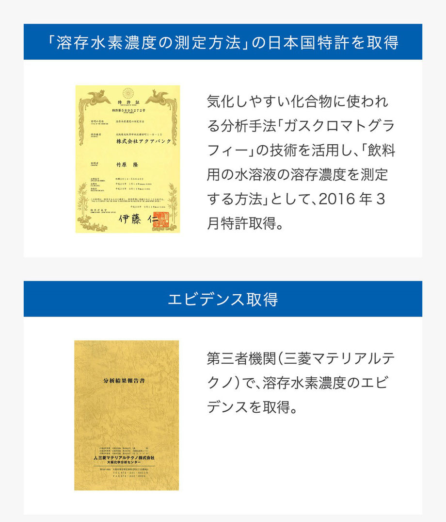 この測定方法は株式会社アクアバンクが考案し、「溶存水素濃度の測定方法」として日本国特許を取得しています。